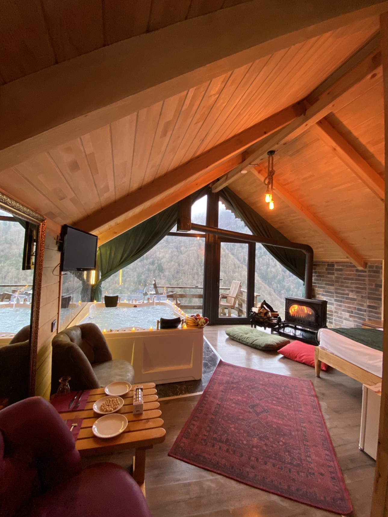 Şömineli Jakuzili Premium Suit Ahşap Bungalov odamız tamamen otantik olarak tasarlanmıştır. Yatak başlıkları ve koltuk takımı özel kütükler kurutulup şekillendirilerek hazırlanmıştır. Odamız 30 m2 genişliğine sahiptir. Odamız muhteşem dağ ve vadi manzarasına hakimdir.